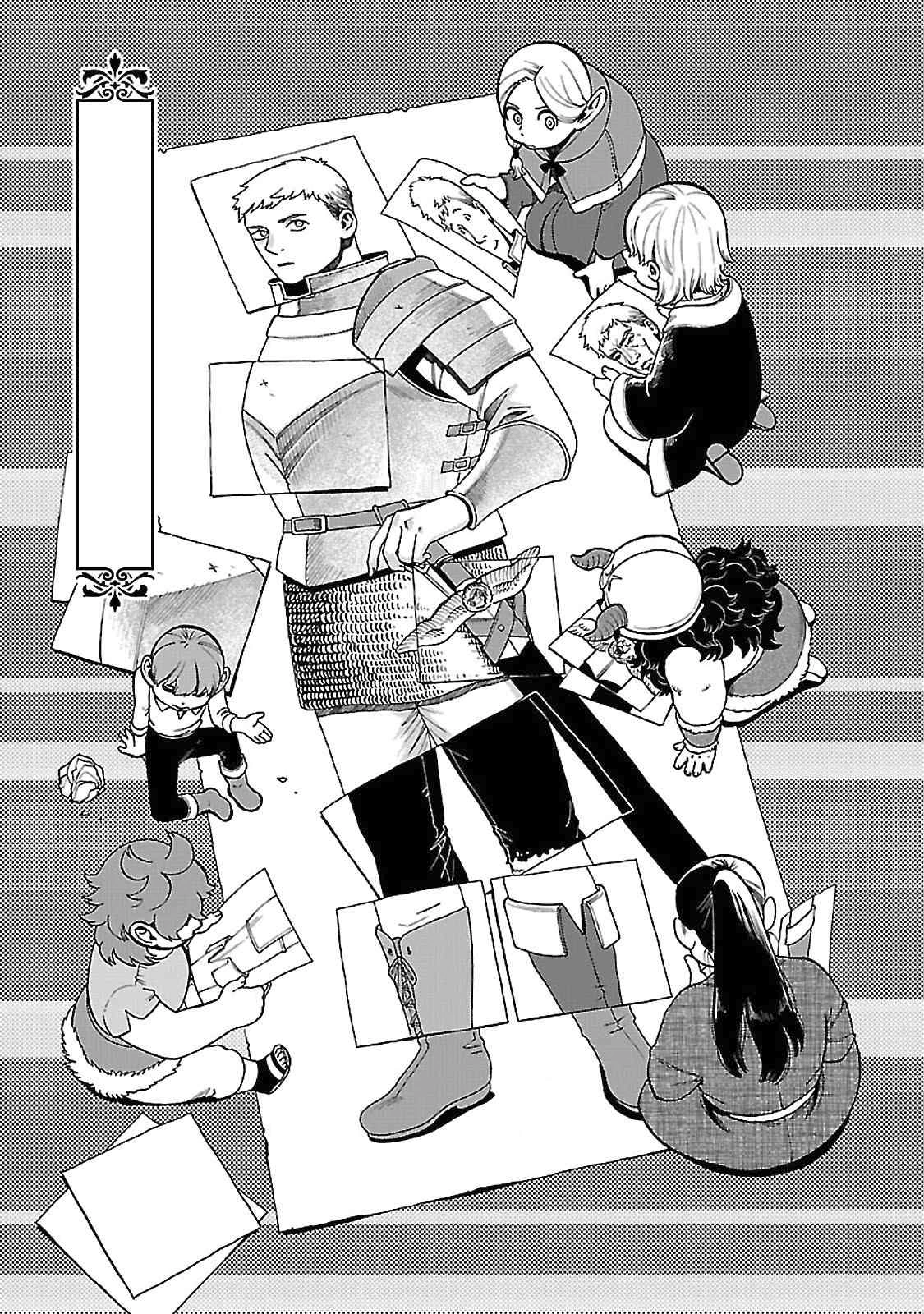 The party, following a trail of Falin's blood, continues downwards to the sixth level of the dungeon. Once they reach the sixth level, they discover that the previously hot level has suddenly become very cold. Since the snow has made tracking Falin's trail impossible, the party decides to head for the place where they were previously wiped out by the Red Dragon. Laios reveals that he has seen the Lunatic Magician before, in one of the Living Paintings, and reveals his plan to deal with them.